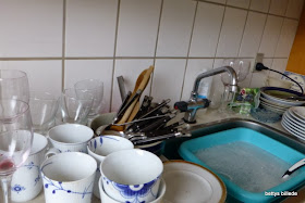 I mit lille køkken er der ikke plads til en opvaskemaskine. Jo, hvis jeg absolut ville, kunne et skab ryddes, men så vil jeg jo mangle det. Jeg overvejer det sommetider, men det er blevet ved overvejelsen.
